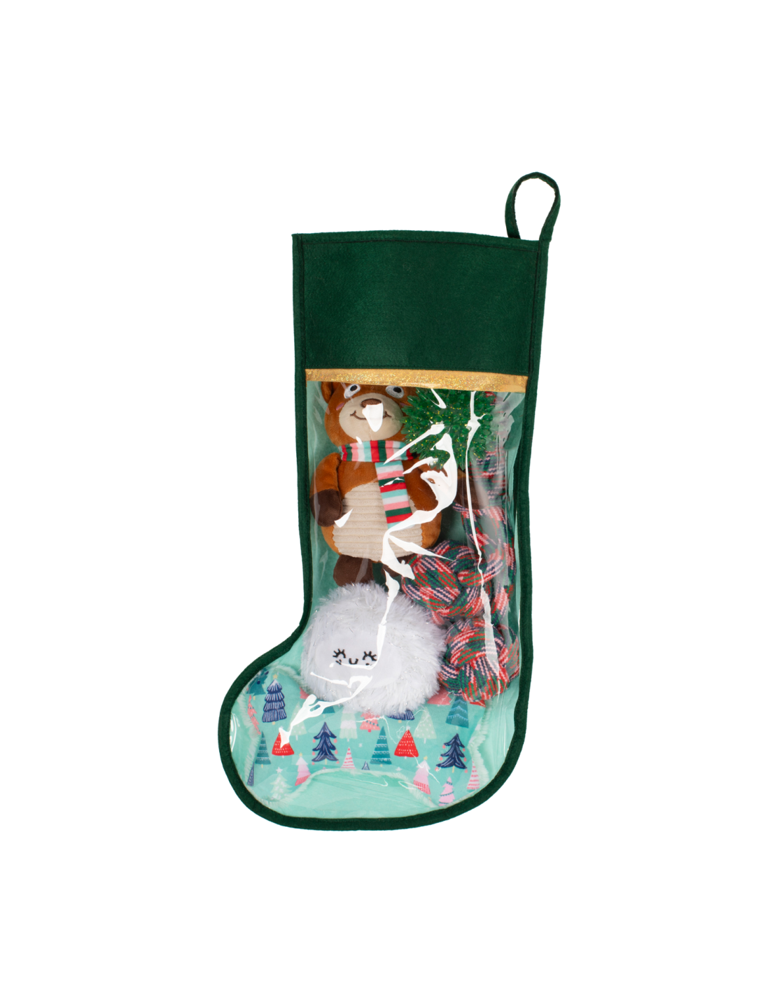 Vier de feestdagen met deze kerstsok gevuld met 3 knuffels, een stekelige TPR piepende glitterbal en een touw met twee apen.