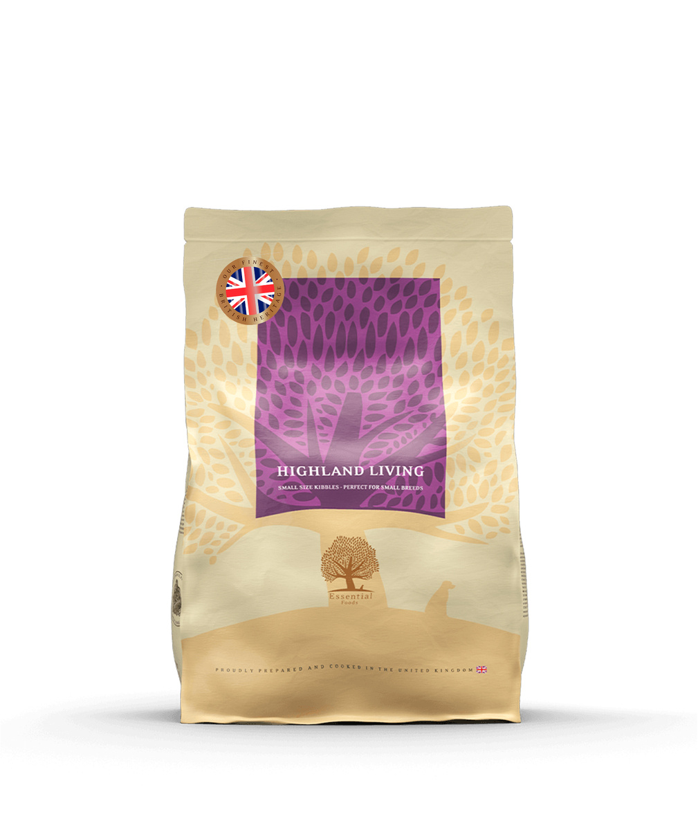 Essential Foods - Highland Living is bereid met heerlijke en gezonde smaken uit de Schotse Hooglanden, zoals Norfolk Black kalkoen, Aberdeen Angus beef, wilde vogels zoals duif en patrijs en natuurlijk Schotse zalm. (79% verse en gedroogde kalkoen, rund, gevogelte, zalm en verse eieren.)