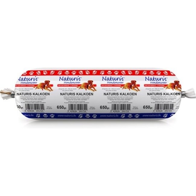 Naturis Kalkoen worst is hypoallergeen, glutenvrij en 100% natuurlijk, zonder synthetische toevoegingen. Het bevat zeewier als bron van vitaminen en is verkrijgbaar in een 650-grams verpakking. Ideaal als voedzaam en smakelijk traktatie voor je viervoeter.