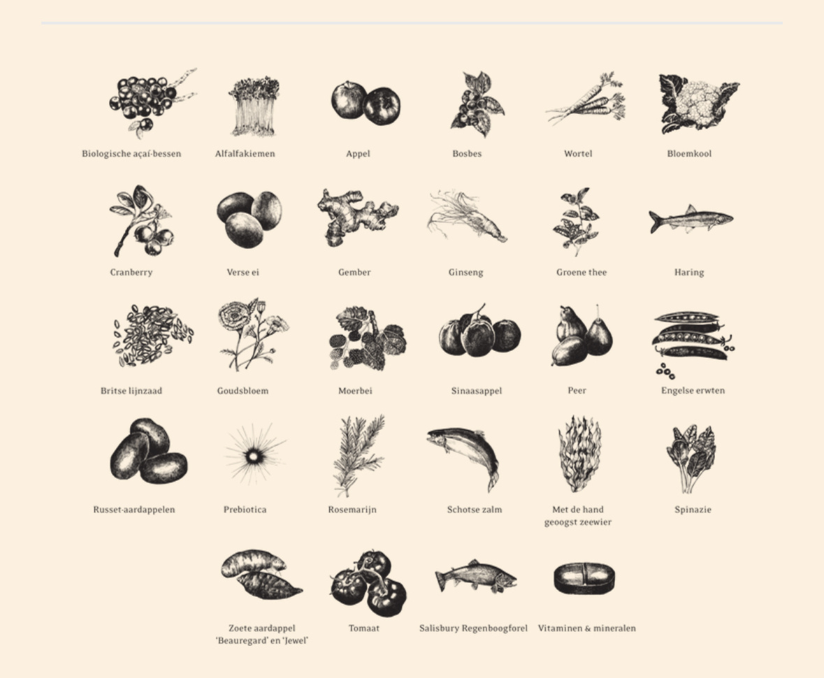 De ingrediënten zijn speciaal geselecteerd omdat ze bijzonder rijk zijn aan waardevolle fytonutriënten, bioflavonoïden vitaminen, en mineralen die gezondheidsbevorderend zijn en een positieve invloed op de vitaliteit hebben.