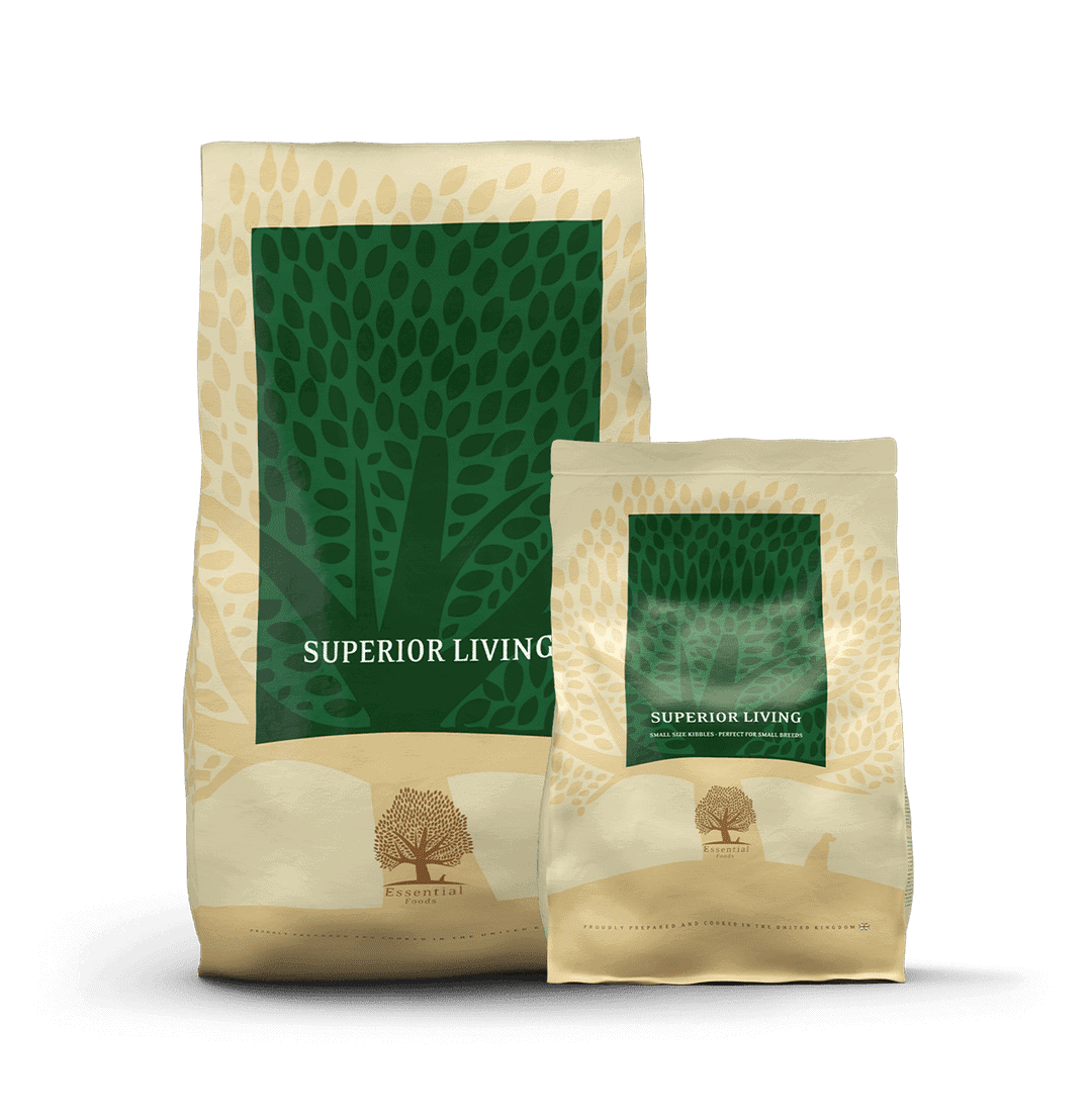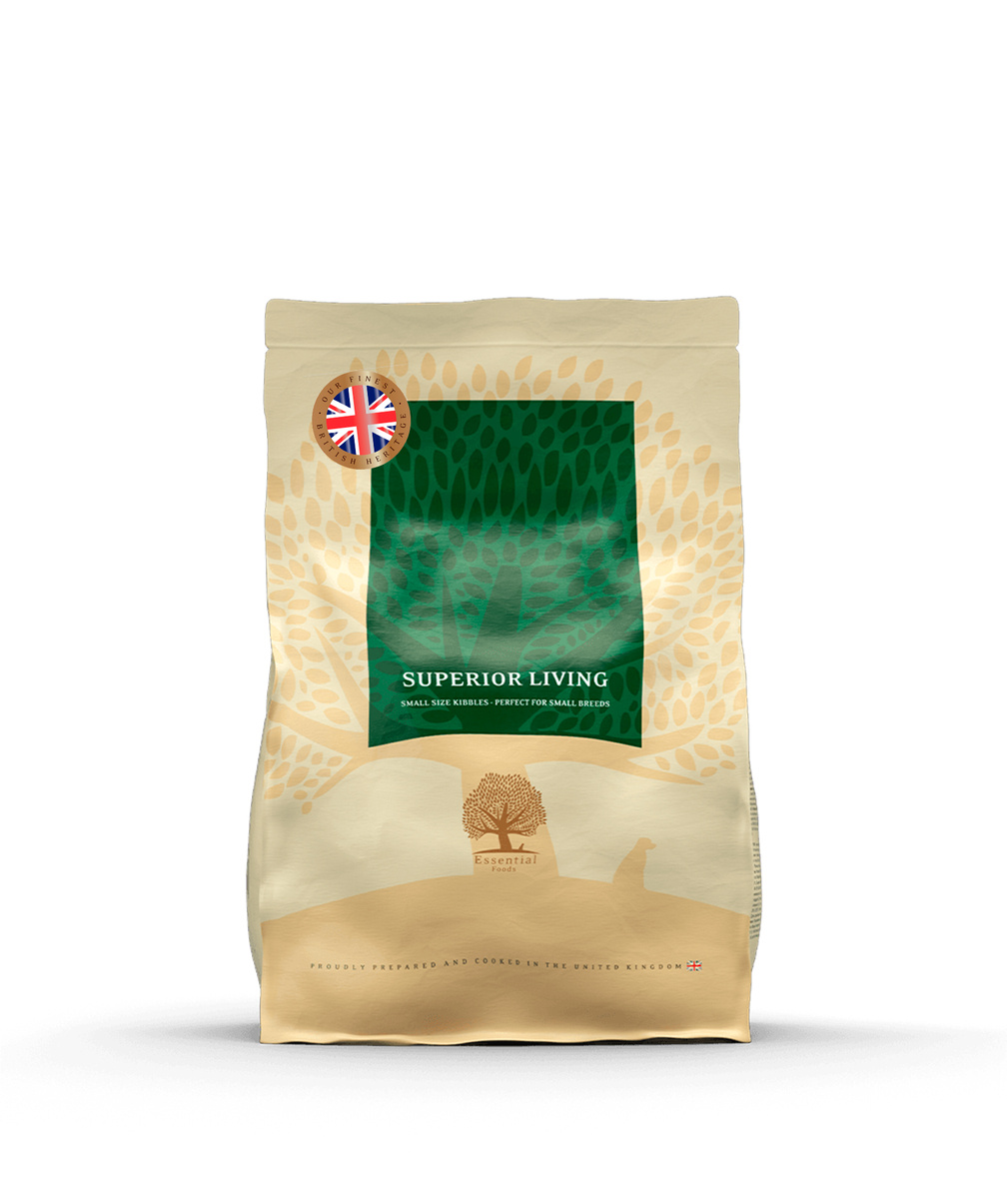 ESSENTIAL SUPERIOR LIVING is een unieke maaltijd die bereid is met verse en gedroogde scharrelkip, vrijlopende eend, Schots wild- en verantwoord gekweekte zalm, Salisbury regenboogforel en verse ei.