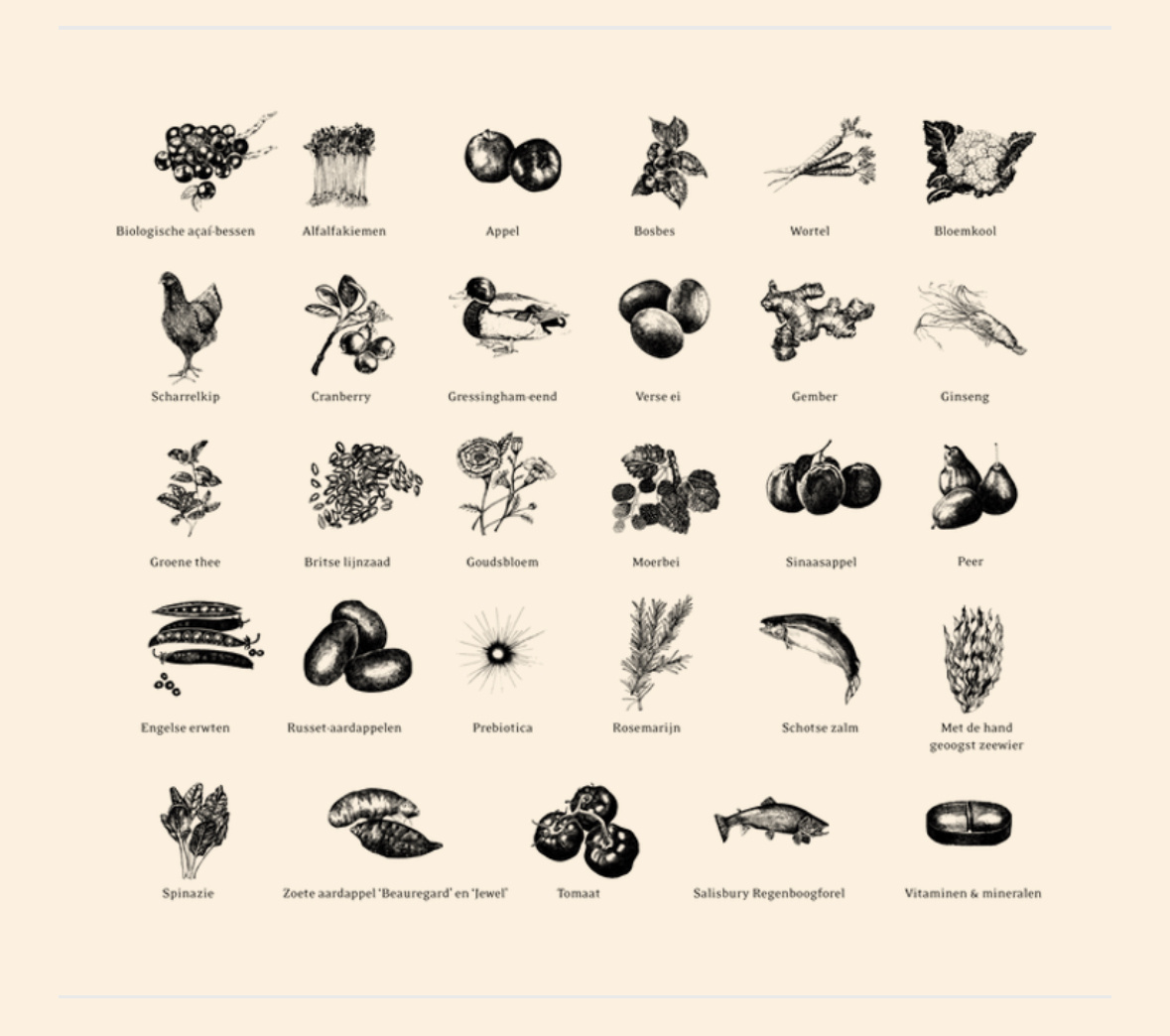 Verse kip en eend, gedroogde kip en eend, zoete aardappel, erwten, verse zalm en forel, lijnzaad, verse hele eieren, kippenvet, aardappel, leverbouillon, alfalfakiemen, vitaminen, mineralen, MOS, FOS, glucosamine*, chondroïtine*, MSM* (*allemaal uit natuurlijke bronnen), cranberry, açaí-bessen, bosbes, moerbes, appel, tomaat, sinaasappel, peer, wortel, spinazie, bloemkool, zeewier, goudsbloem, ginseng, groene thee, gember.