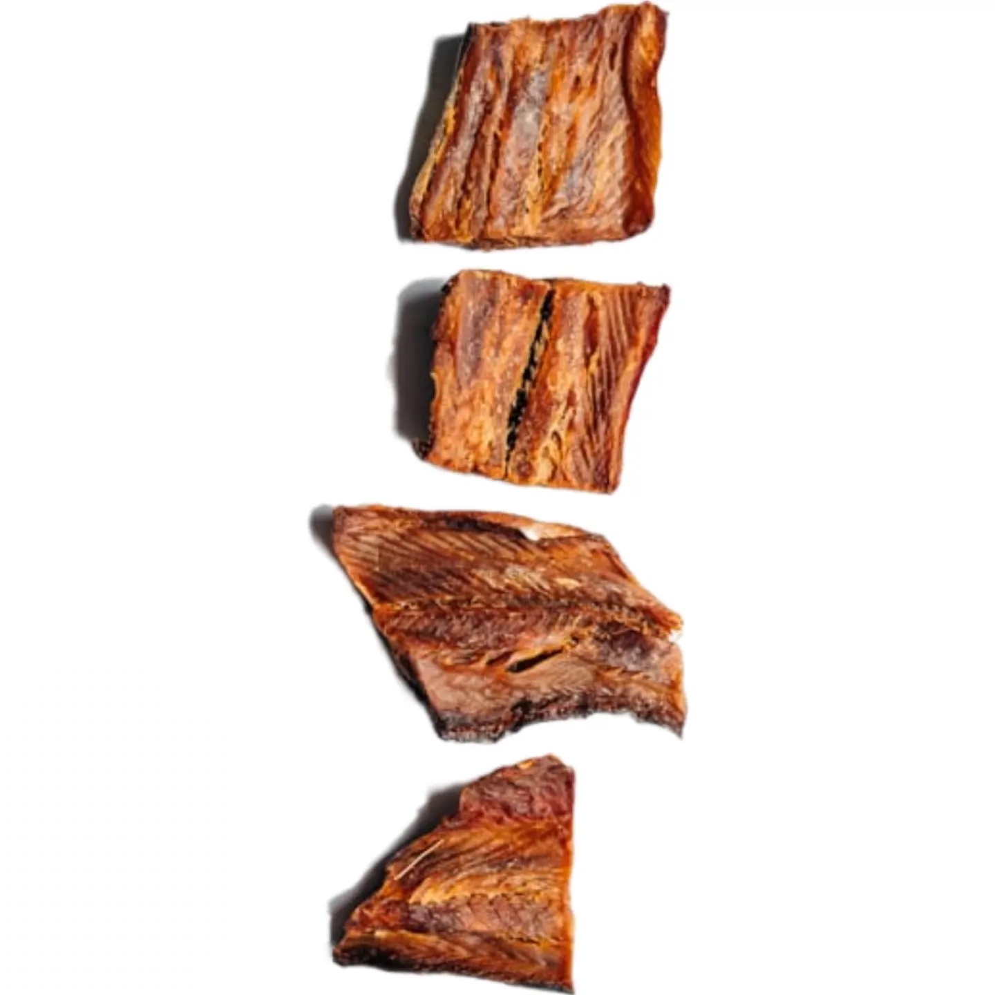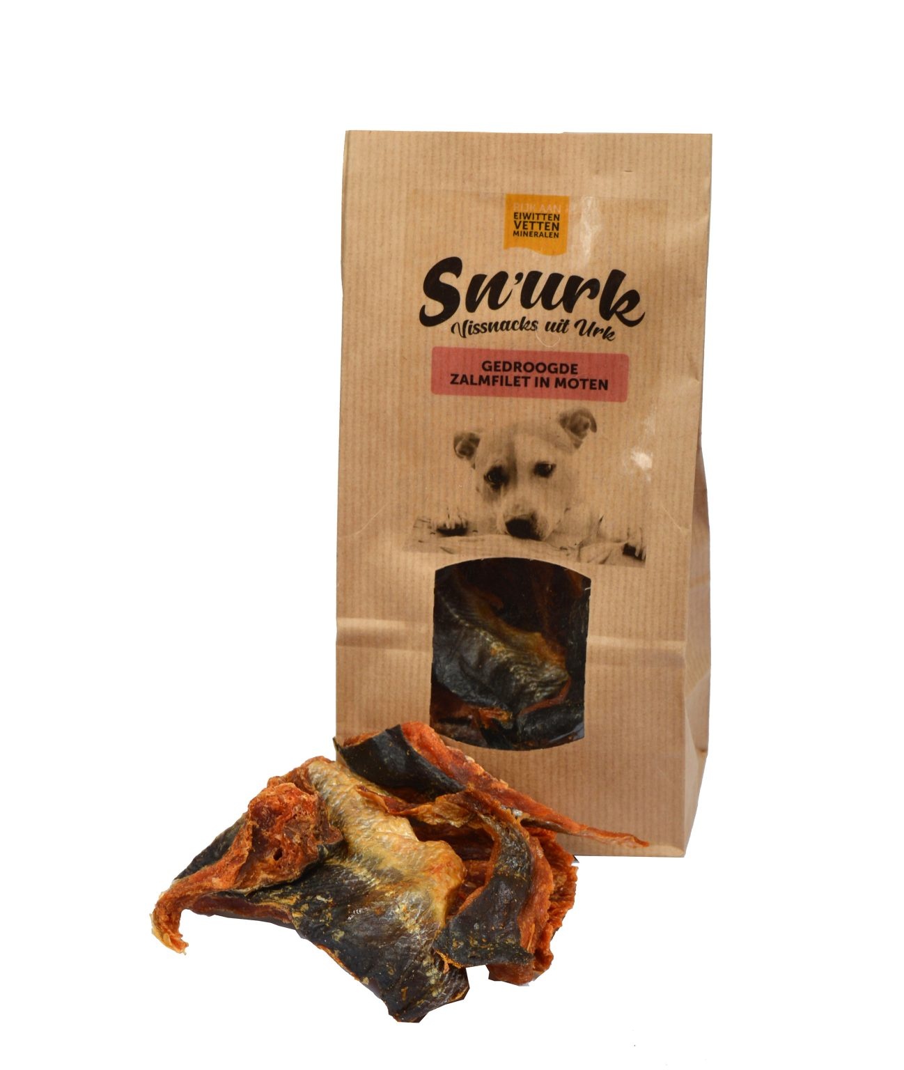 Gedroogde zalmmoten met huid van wilde zalm. Een vismenu voor een hond, rijk aan eiwitten, vetten en mineralen. Vissnacks dragen bij aan een gezonde vacht, huidconditie en soepele gewrichten.